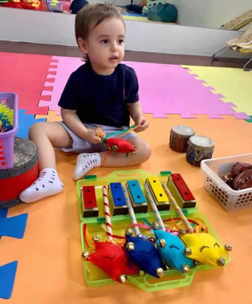 O uso de instrumentos musicais como meio de desenvolvimento motor, associados ao senso rítmico, está no centro das aulas de iniciação musical ministrada pela professora Amália de Vincenzo, pedagoga graduada em pós-neuroeducação e música. Para ela , a utilização dos instrumentos musicais com este enfoque conscientiza os bebês com movimentos bilaterais paralelos e movimentos com lateralidade dissociada ou alternada.A atividade propõe técnicas para musicalizar o bebê nos seus 1 e 2 anos de vida, respeitando seu desenvolvimento cognitivo- musical, dividindo em quatro fases de maturidade.